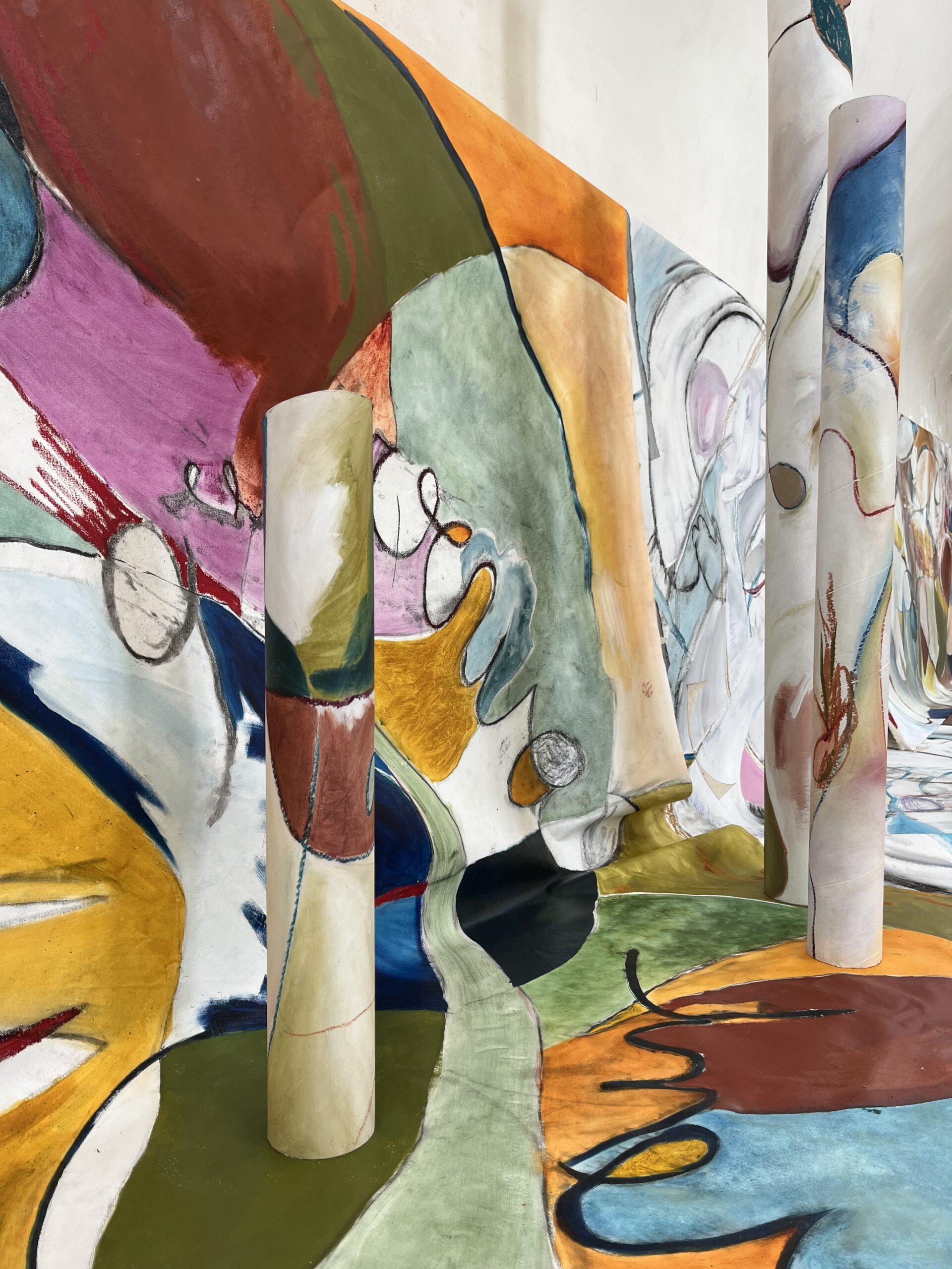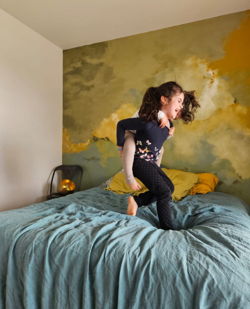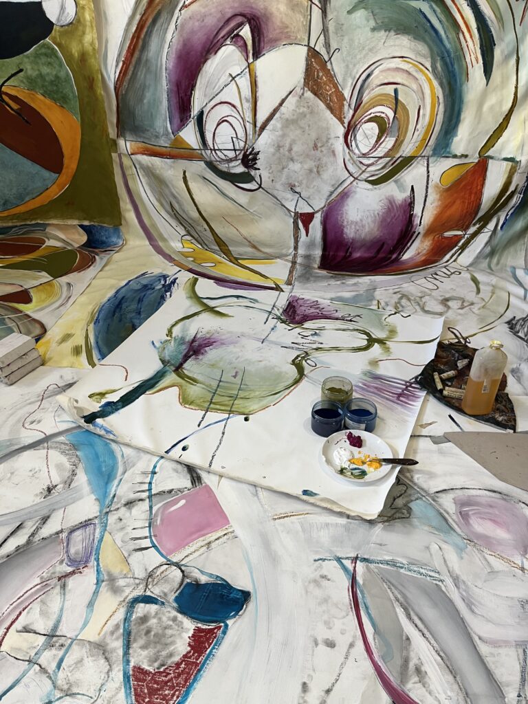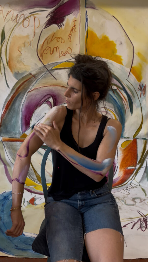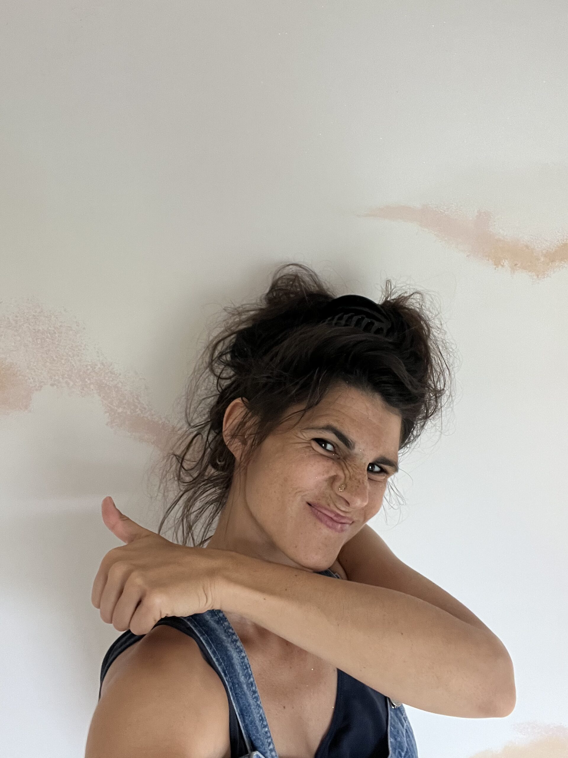 Louise Dutertre s’intéresse à l’implication du corps dans sa peinture. Du sien, à travers la danse ou la transe, cet état ou le corps est et où il ne fait plus qu’un avec l’âme. Mais aussi celui du spectateur lorsque sa position dans l’espace influence sa vision de l’oeuvre ou de la performance. Louise est une alchimiste sincère qui cherche à faire corps accord avec sa peinture. Et ça ne l’empêchera pas de faire des fresques inspirés des nuages sur vos murs à vous!
