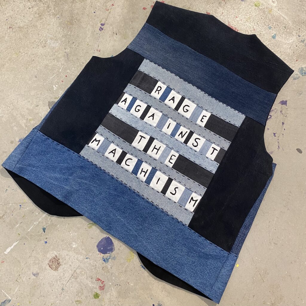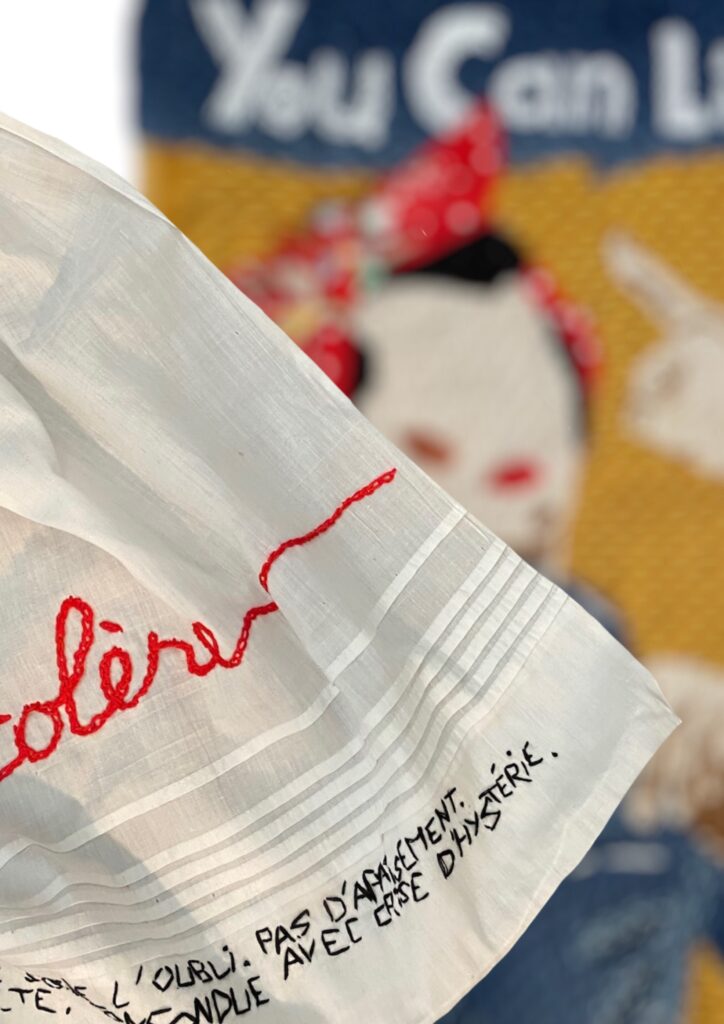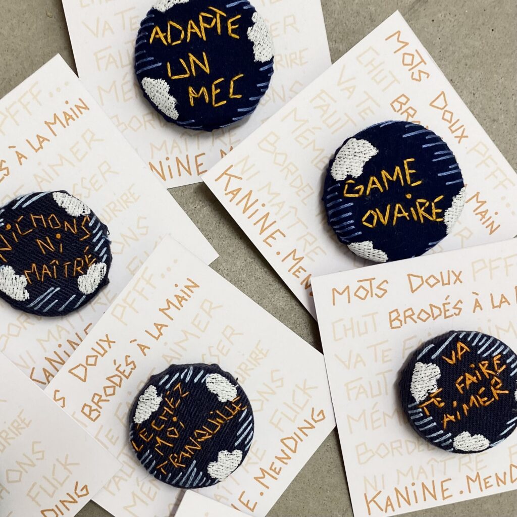 Kanine se nourrit de nombreuses techniques comme le patchwork et le Sashiko issu de la broderie japonaise, elle ajoute sa singularité en brodant des citations engagées, des motifs de sa création, ou encore des portraits. Kanine partage son savoir faire chaque semaine lors d’ateliers.